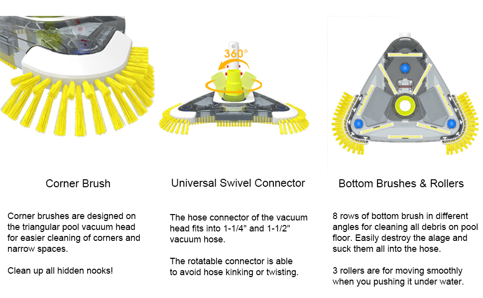 Pool Vacuum Head with Corner Bristles, EZ Clip Handle Universal Swivel Connector for Pool Hose